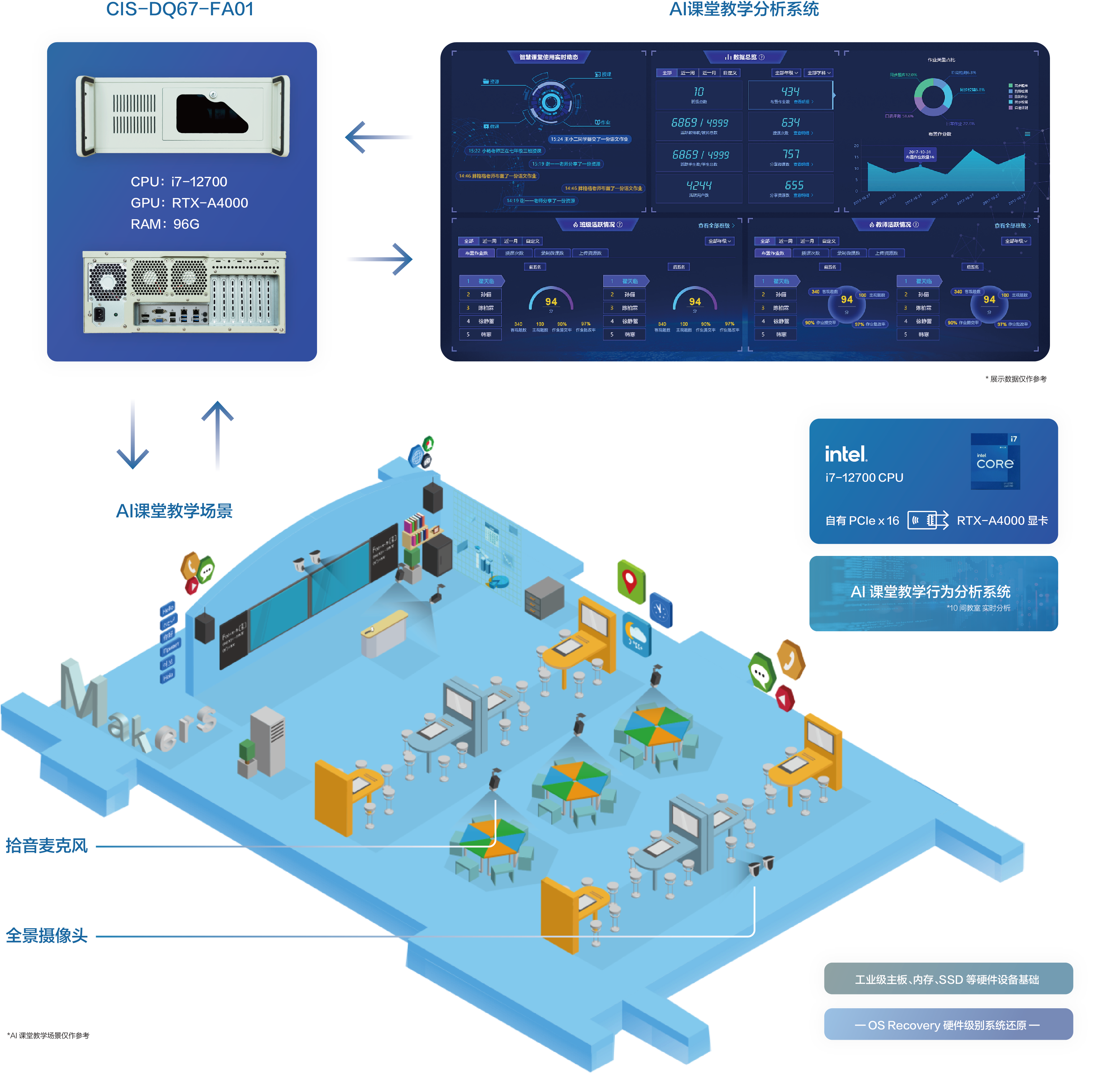 基于用户需求,九州酷游官网提供基于CIS-DQ67-FA01 4U箱体电脑为核心计算单元的AI课堂教学分析解决方案,该方案具备以下优势: